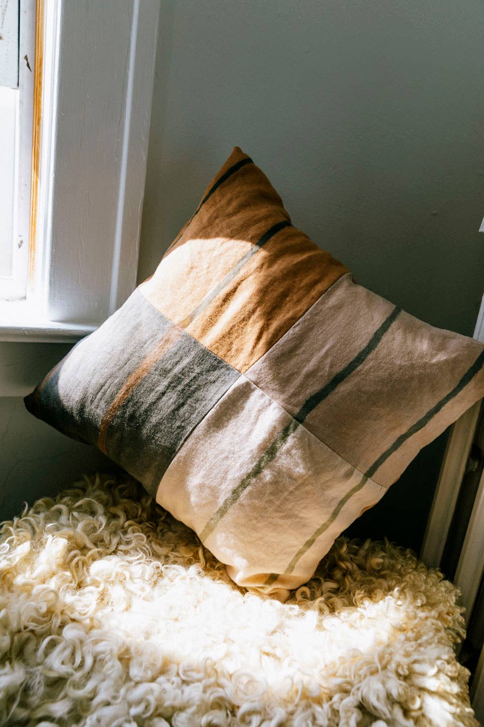 A hand painted patchwork linen pillow. Our pillows are hand made using naturally dyed scrap linen fabric in our Detroit studio.